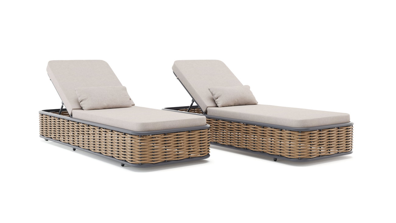 Hojnie wyściełane poduszki zapewniają pierwszorzędny komfort na obu leżakach, podczas gdy miękka, utrzymana w neutralnych barwach tkanina jest zdejmowana, łatwa w pielęgnacji i specjalnie zaprojektowana do użytku zewnętrznego. Każdy leżak jest dodatkowo wyposażony w pasującą poduszkę lędźwiową, która zapewnia jeszcze większy relaks.