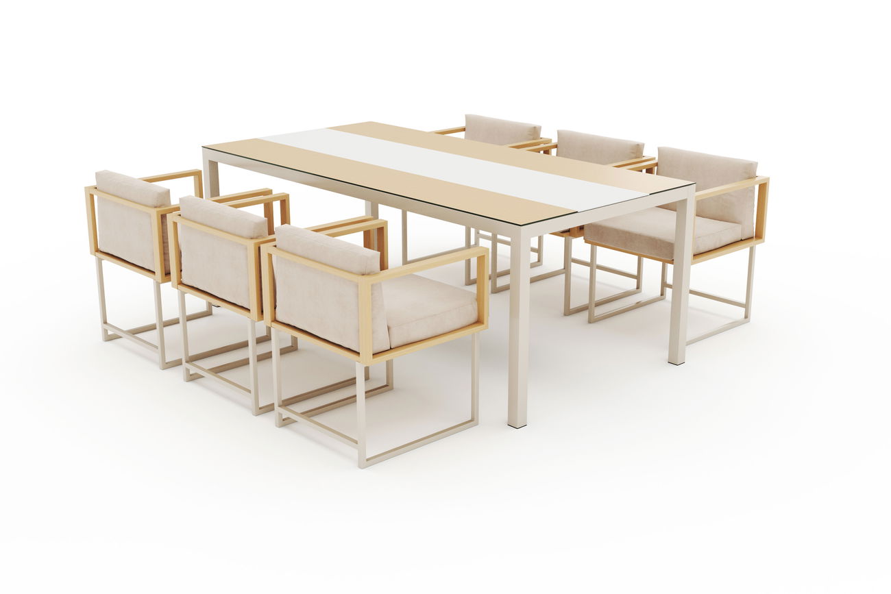 Połączenie wytrzymałej aluminiowej ramy z eleganckim wykończeniem imitującym drewno nadaje zestawowi naturalny, a jednocześnie nowoczesny wygląd. Starannie wykonany blat stołu z wysokiej jakości materiału wyróżnia się trwałością i łatwą w pielęgnacji powierzchnią. Eleganckie nogi stołu w kolorze szampańskim tworzą harmonijny kontrast i stylowo dopełniają design.