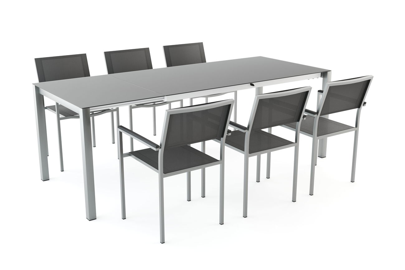 Uzupełnieniem zestawu jest rozkładany stół, który dzięki wysokiej jakości stelażowi ze stali nierdzewnej i eleganckiej ciemnej szklanej powierzchni wnosi nutę wyrafinowania do Twojej przestrzeni zewnętrznej. Jego rozmiar można dostosować, rozkładając go ze 160 cm do 220 cm, co zapewnia elastyczność dla różnych okazji, jednocześnie stanowiąc idealną scenę dla Twoich kulinarnych doświadczeń na świeżym powietrzu.