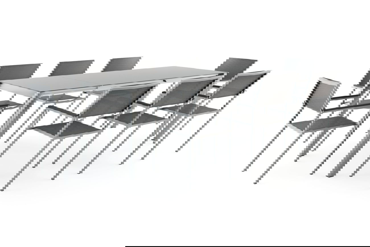 Zestaw jadalniany składa się z sześciu krzeseł, które nie tylko wyposażone są w hojne 5 cm grubości poduszki siedziska i 3 cm grubości poduszki oparcia, zapewniające najwyższy komfort Tobie i Twoim gościom, ale są również układane w stos, co pozwala zaoszczędzić miejsce w razie potrzeby i zapewnia elastyczność. Każde krzesło posiada wytrzymałą ramę ze stali nierdzewnej, która jest znana nie tylko ze swojej trwałości, ale także stanowi symbol ponadczasowej elegancji. Siedziska i oparcia są pokryte Textilene, oddychającym materiałem, który zapewnia przyjemną świeżość nawet w ciepłe wieczory.