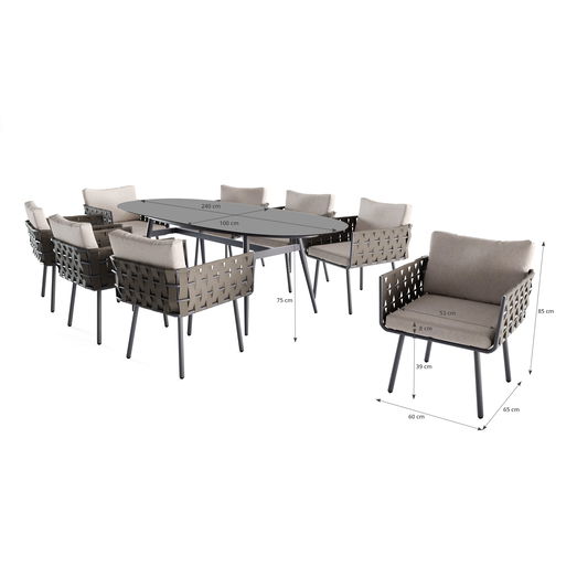 Podłokietniki i oparcia krzeseł są wykonane z wytrzymałego aluminium i pokryte szlachetnym plecionym sznurkiem w szarobrązowym kolorze, co nadaje poczucie ekskluzywności. Obficie wyściełane siedziska w ciepłym beżowym kolorze zapewniają najwyższy komfort i zapraszają do relaksujących doświadczeń kulinarnych.