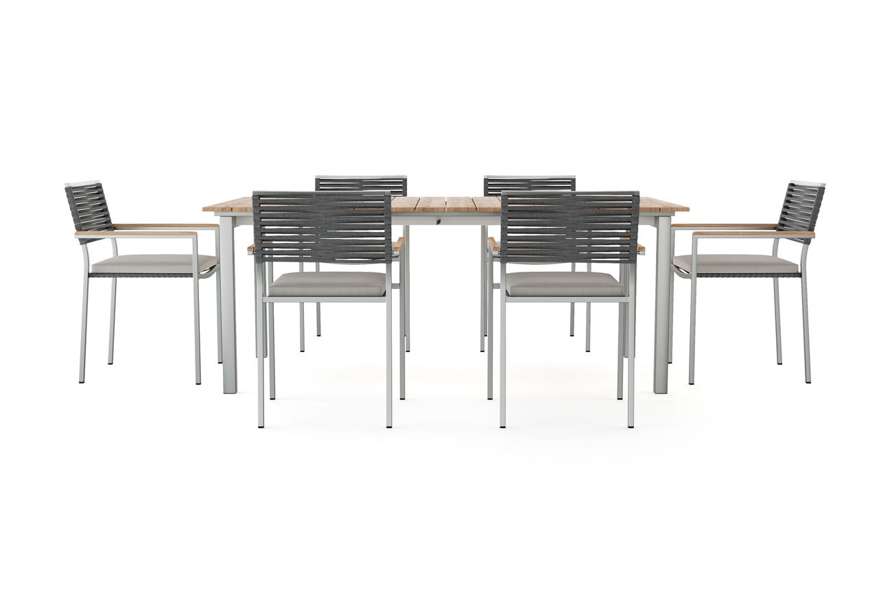 Ze swoimi eleganckimi krzesłami, zestaw jadalniany Baki zaprasza do odprężenia się i cieszenia życiem. Krzesła posiadają wytrzymałą, nierdzewną ramę ze stali nierdzewnej, gwarantującą długotrwałą elegancję. Podłokietniki są artystycznie ozdobione drewnem tekowym, nadając poczucie naturalnego piękna. Siedziska, ręcznie wyplatane z przepuszczającego powietrze sznurka, oferują nie tylko wyjątkowy komfort, ale także umożliwiają przyjemny relaks w ciepłe dni. Każde krzesło jest uzupełnione miękką poduszką siedziska, która dopełnia poczucie luksusu i przytulności.