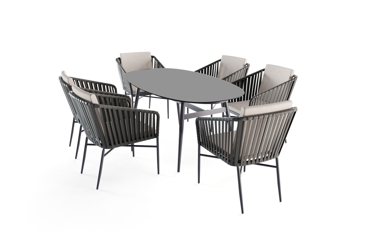 Połączenie wysokiej jakości materiałów i przemyślanego designu sprawia, że Marla Dining 6 jest prawdziwym arcydziełem. Blat stołu wykonany z 5 mm hartowanego szkła bezpiecznego w eleganckim mlecznym wykończeniu emanuje ponadczasowym wdziękiem. Gładka, matowa powierzchnia w kolorze antracytowym doskonale uzupełnia ręcznie pleciony materiał wierzchni z 20 mm szerokiej liny olefinowej. Materiał ten jest nie tylko barwiony w masie i szybkoschnący, ale także niezwykle odporny na działanie żywiołów.