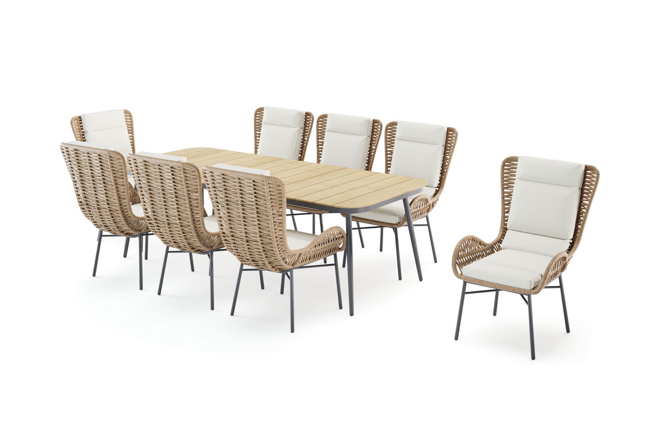 Stwórz niezapomniane chwile na świeżym powietrzu z zestawem Mistral Dining 8, wyrafinowaną grupą jadalną na towarzyskie letnie wieczory. Ta kolekcja obejmuje osiem eleganckich krzeseł i stylowy stół jadalny, które przekonują harmonijnym designem i wysokiej jakości materiałami.