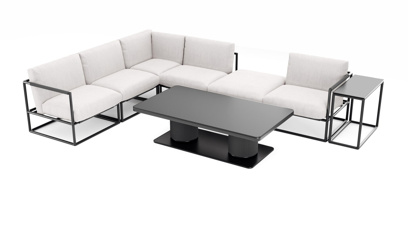 Zestaw oferuje miejsce dla maksymalnie 6 osób i obejmuje pufy, fotele, sofy środkowe i narożne, sofy końcowe oraz stoliki pomocnicze. Wszystkie elementy są precyzyjnie ze sobą skoordynowane i tworzą harmonijny, elegancki Lounge, który w równym stopniu emanuje komfortem i designem.