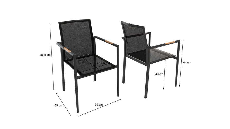 Czarne jak noc! Dwa krzesła "Tex O" to absolutny must-have dla wszystkich poszukujących nowoczesnego i stylowego wyglądu. Podłokietniki z teakową wstawką stanowią wizualny akcent, a wysokiej jakości tkanina w kolorze czarnym zapewnia odporną na warunki atmosferyczne i elegancką tapicerkę. Krzesło doskonale pasuje do czarnego leżaka "Tampa" i idealnie integruje się z zestawem mebli ogrodowych. Te krzesła wraz z naszym eleganckim rozkładanym stołem "Varios" tworzą również zestaw jadalniany "Opposes". Czy to na spontaniczną wizytę, czy na przytulny wieczór na świeżym powietrzu - "Tex O" zachwyci Cię swoim czarnym designem.