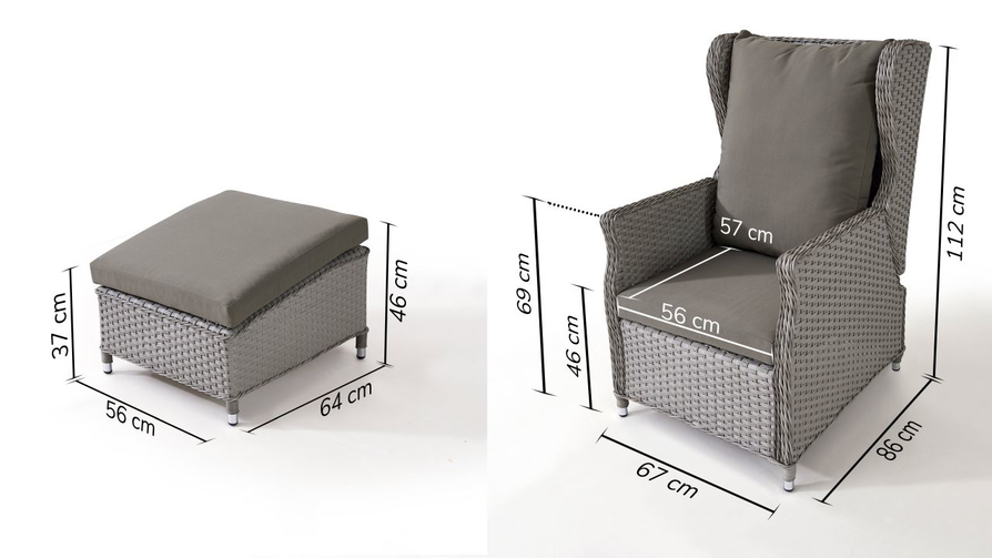 Nasz fotel uszak "Chesta" to czysty luksus! Wszechstronny mebel z linii "Classic", który dzięki swojemu eleganckiemu i ponadczasowemu designowi z pewnością zdobędzie każdego. Hydraulicznie regulowane oparcie to nie jedyny atut. Pełne, pikowane poduszki zapewniają dodatkowy komfort. Dzięki pasującemu podnóżkowi można położyć zmęczone nogi. Fotel w krótkim czasie staje się ulubionym miejscem, w którym można w pełni cieszyć się chwilą relaksu. Połączenie okrągłych i płaskich włókien rattanowych w kolorze szarym satynowym sprawia, że fotel przyciąga wzrok. Splecione na aluminiowej ramie pokrytej proszkowo, nasze meble są lekkie, a jednocześnie stabilne. Meble są wytwarzane zgodnie z naszymi specyfikacjami w tradycyjnym rzemiośle. Każdy element jest unikatowy, wszystkie części idealnie do siebie pasują. Pokrowce ochronne i zapasowe pozwalają chronić meble i umożliwiają indywidualne aranżacje. Montaż jest prosty i szybki. Fotel jest gotowy do użycia od razu, czyszczenie i pielęgnacja są bezproblemowe. Oferujemy również pasujące zestawy wypoczynkowe, zestawy do jadalni i wyspy słoneczne. Odkryj wiele innych ekskluzywnych mebli ogrodowych w naszym sklepie!