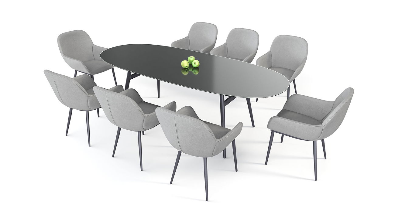 Owalny stół jadalny o długości 240 cm oferuje wystarczająco dużo miejsca na towarzyskie spotkania i uroczyste posiłki na świeżym powietrzu. Blat stołu z mlecznego szkła nadaje zestawowi nowoczesny akcent, podczas gdy antracytowa rama tworzy solidną, a jednocześnie stylową podstawę.