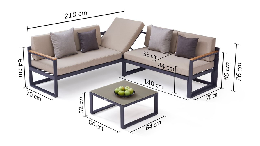 Kolejny zestaw wypoczynkowy z kolekcji 2020, który jest nie tylko stylowy, ale także praktyczny i wszechstronny. Narożnik oferuje miejsce dla 5 osób. Lounge sprawia wrażenie otwartego i zaprasza do relaksu dzięki wygodnym poduszkom. W mgnieniu oka powierzchnia siedziska 3-osobowej sofy zamienia się w wygodne łóżko - nic nie stoi na przeszkodzie, aby zażyć kąpieli słonecznej! Dwuosobowa sofa może być używana jako pojedyncza sofa poprzez zamontowanie dwóch dołączonych podłokietników lub może być połączona z trzyosobową sofą, tworząc narożnik. Również oparcia w kształcie klina zapewniają absolutny komfort. Pasujący mały stolik jest również pokryty proszkowo, a mleczna szklana płyta harmonizuje kolorystycznie i doskonale wpasowuje się w ogólną koncepcję. Podłokietniki w optyce drewna tekowego sprawiają, że cały zestaw wygląda swobodnie i nowocześnie. Wszystkie elementy zestawu mogą być również ustawione osobno. Kolorystycznie dopasowane poduszki dekoracyjne w kolorach grafitowym i szarym są częścią dostawy.